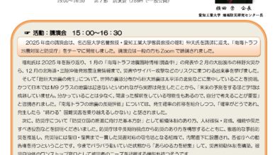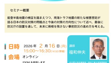 イベント 【聴講者募集】2月あいぼう会講演会のご案内 2月のあいぼう会は、会員以外の方でも(どなたでも)ご参加いただける講演会(オンライン)を開催いたします。 今回は、 福和伸夫氏(名古屋大学名誉教授・愛知工業大学客員教授)をお招きし、「南海トラフ地震対... 2026.01.08 イベント