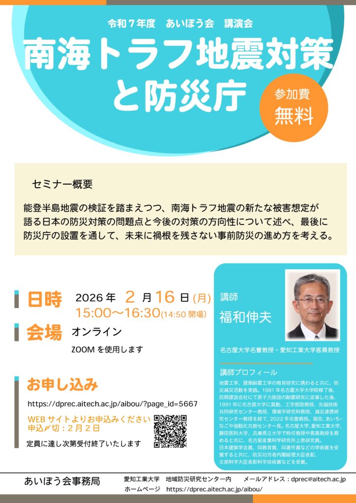 【聴講者募集】2月あいぼう会講演会のご案内 イベント X Facebook LINE コピー 2026.01.08 2月のあいぼう会は、会員以外の方でも(どなたでも)ご参加いただける講演会(オンライン)を開催いたします。 今回は、 福和伸夫氏(名古屋大学名誉教授・愛知工業大学客員教授)をお招きし、「南海トラフ地震対策と防災庁」ご講演いただきます。 下記より参加申込いただけます。多くの方のご参加をお待ちしております。 令和7年度あいぼう会講演会参加申込フォーム
